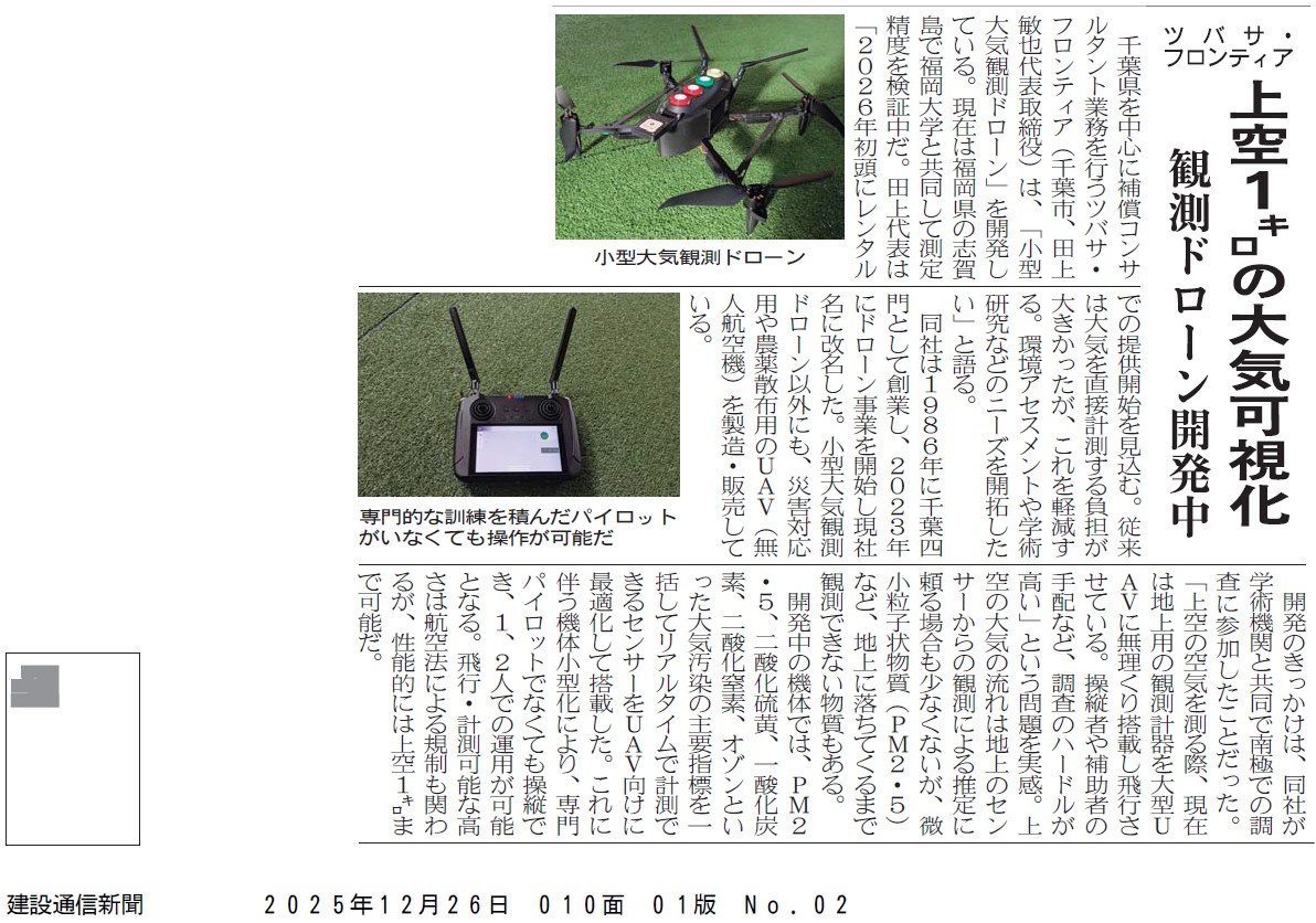 弊社が開発を進めている小型大気観測ドローンが、【建設通信新聞(2025年12月26日号 010面)】にて紹介されました。